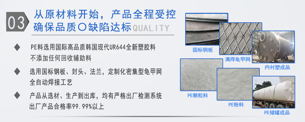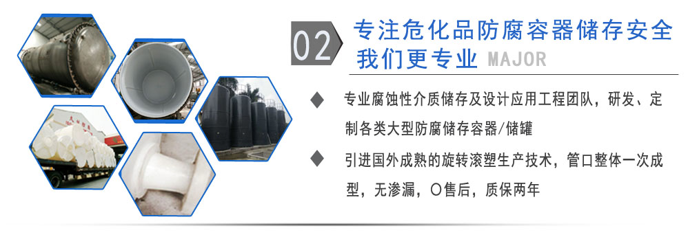 公司有鋼襯塑PE/PO、PE全塑、碳鋼、不銹鋼四大系列100多個品種,專注于常壓儲存容器生產,其產品包括鋼襯塑儲罐、管口一體成型PE儲罐、碳鋼儲罐不銹鋼儲罐、反應釜、攪拌罐、離子交換柱、鋼襯PE/PO儲罐塑料儲罐、鹽酸儲罐、硫酸儲罐等等。更大限度滿足廣大客戶的各種需求,同時可以根據客戶的需要加工定制各種防腐設備。
